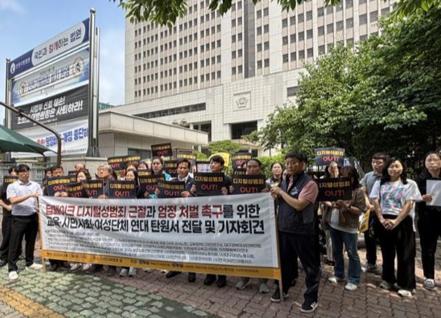 인천교사노동조합과 인천여성회 측이 지난 6월 17일 미추홀구 인천지법 앞에서 딥페이크(인공지능 기반 이미지 합성) 디지털 성범죄 엄벌을 촉구하는 기자회견을 하고 있다. 이환직 기자