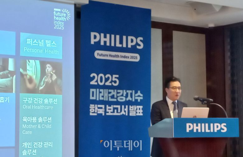 최낙훈 필립스코리아 대표가 27일 서울 중구 웨스틴조선호텔에서 열린 ‘필립스코리아 미래건강지수 2025 한국보고서’ 발간 기자간담회에서 발표하고 있다.