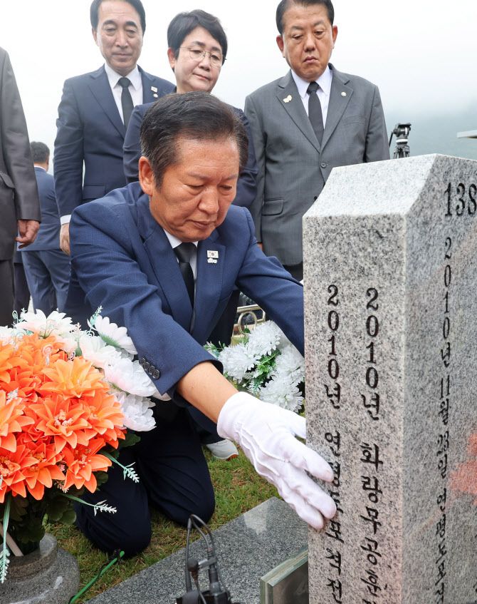 정청래 더불어민주당 대표가 27일 오전 대전 유성 국립대전현충원 연평도 포격전 전사자 묘역을 참배하고 있다. (사진=뉴시스) |