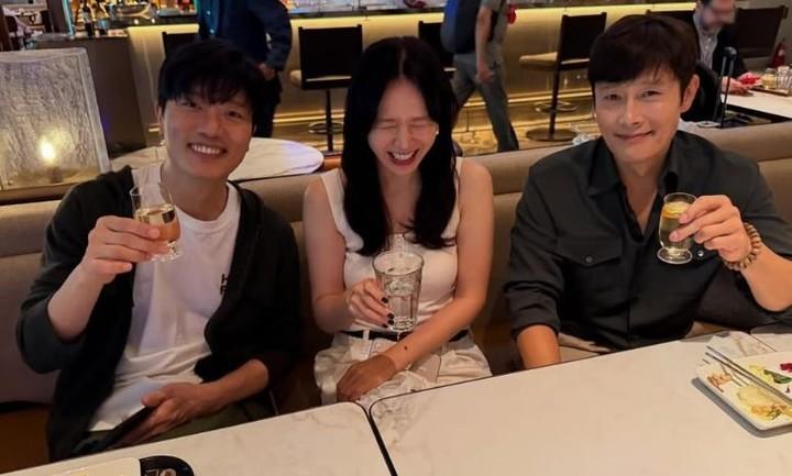 사진 속 그는 영화 '어쩔수가없다'에 함께 출연한 배우 이병헌, 박희순과 베니스영화제 참석차 출국하기 위해 만난 모습이다. 함께 잔을 들어올리고 화기애애한 모습을 보였다.