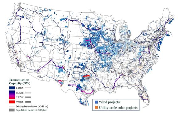 넷제로 아메리카 프로젝트의 2050년 미국 에너지 인프라 전망. 프린스턴대가 개발한 넷제로 아메리카 연구는 2050년까지 미국 전역에 3.2TW 규모의 풍력과 태양광 발전 시설 구축과 송전망 용량의 3배 확대가 필요함을 보여준다. [사진=KAIST] |