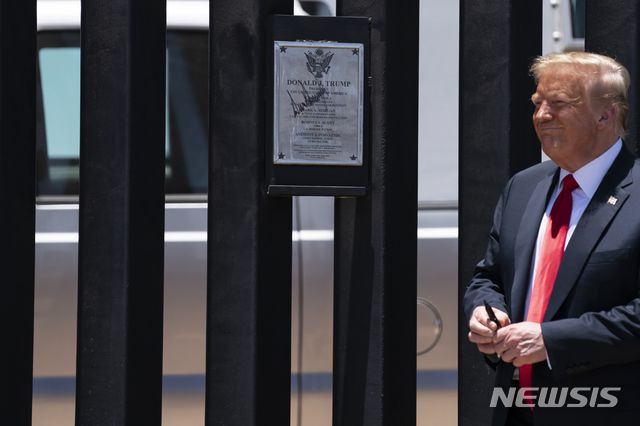 [산루이스=AP/뉴시스]도널드 트럼프 미국 대통령이 23일(현지시간) 미 애리조나주 산루이스의 국경장벽을 방문해 장벽에 서명 후 미소짓고 있다. 2020.06.24.