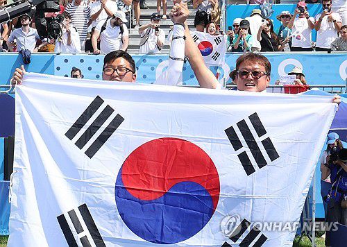 파리 올림픽 양궁 전 종목 석권의 순간, 김우진과 함께 태극기 든 박성수 감독(오른쪽) |
