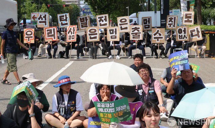 [서울=뉴스핌] 양윤모 기자 = 민주노총 공공운수노조 조합원들이 27일 오후 서울 용산구 삼각지역 부근에서 '발전 비정규직 노동자 총파업 대회'를 개최하고 있다. 집회 참석자들은 올해 말 태안화력 1호기를 시작으로 석탄화력발전소 폐쇄에 따른 고용 보장 방안을 요구했다. 2025.08.27 yym58@newspim.com |