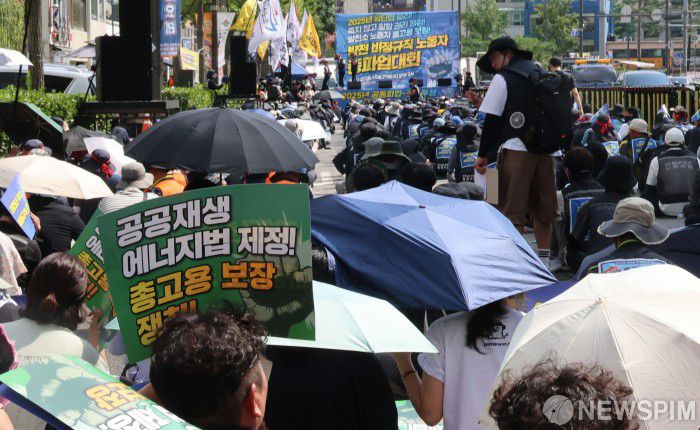 [서울=뉴스핌] 양윤모 기자 = 민주노총 공공운수노조 조합원들이 27일 오후 서울 용산구 삼각지역 부근에서 '발전 비정규직 노동자 총파업 대회'를 개최하고 있다. 집회 참석자들은 올해 말 태안화력 1호기를 시작으로 석탄화력발전소 폐쇄에 따른 고용 보장 방안을 요구했다. 2025.08.27 yym58@newspim.com