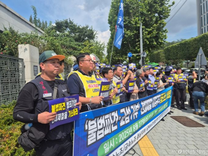 27일 오전 11시 서울 서초구 대검찰청 정문 앞에서 민주노총 산하 전국금속노조 충남지부 현대제철 비정규직 지회가 기자회견을 열었다. /사진=양윤우 기자 |