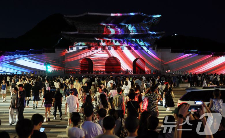16일 오후 서울 광화문 앞에서 시민들이 광복 80년 빛 축제 '80개의 빛, 하나된 우리' 미디어 파사드 영상을 보고 있다. 2025.8.16/뉴스1 ⓒ News1 김명섭 기자 |