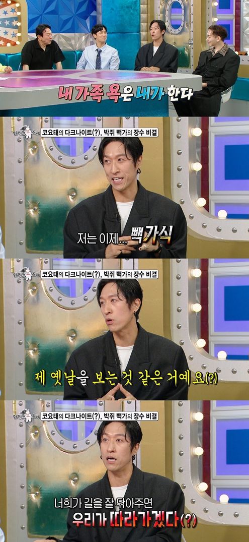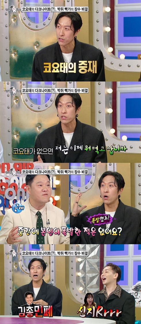 특히 빽가는 코요태의 다툼을 중재하는 자신만의 방법도 공개했는데, 박쥐처럼 신지에게는 김종민 욕을, 김종민에게는 신지 욕을 하는 ‘뒷담화 중재법’을 밝혀 스튜디오를 폭소케 한다.