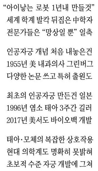 정말 인공자궁은 머지않은 미래에 실현할 수 있는 기술일까. 관련 연구를 하고 있는 강윤정 차의과대 생화학교실 교수는 "현재 인공자궁 기술을 완성도 측면에서 보면 아직 갈길이 멀다"고 했다. 그는 "실제 자궁을 완전히 대체할 정도의 기술은 당분간은 보기 어려울 것"이라며 "이번 중국 업체의 말처럼 상업화까지 가는 건 아직 먼 이야기"라고 했다.