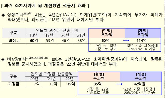 증선위에 따르면, 신외부감사법 개정(2017년 개정)을 통해 회계부정 과징금이 도입되었는데, 과징금 도입 초기에는 과도한 과징금의 부작용을 막기 위해 위반금액이 가장 큰 연도의 과징금만 부과되도록 기준을 마련·운용해왔다.