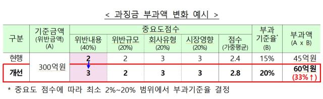 구체적으로는 제재 양정시 위반내용(40% 비중)에 대한 중요도*를 현재 ‘중’(2점)에서 ‘상’(3점)으로 상향하여 적용한다. 이 경우 전체 중요도 점수가 올라가 부과기준율이 상향됨에 따라 과징금 부과액이 늘어나게 된다.