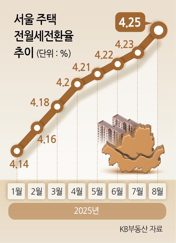 올 들어 서울 전월세전환율은 지난해 말부터 10개월 연속 올랐다. 지난해 10월 4.10%였던 전월세전환율은 올 1월 4.14%→4월 4.20%→7월 4.23%→8월 4.25% 등의 추이를 보였다.