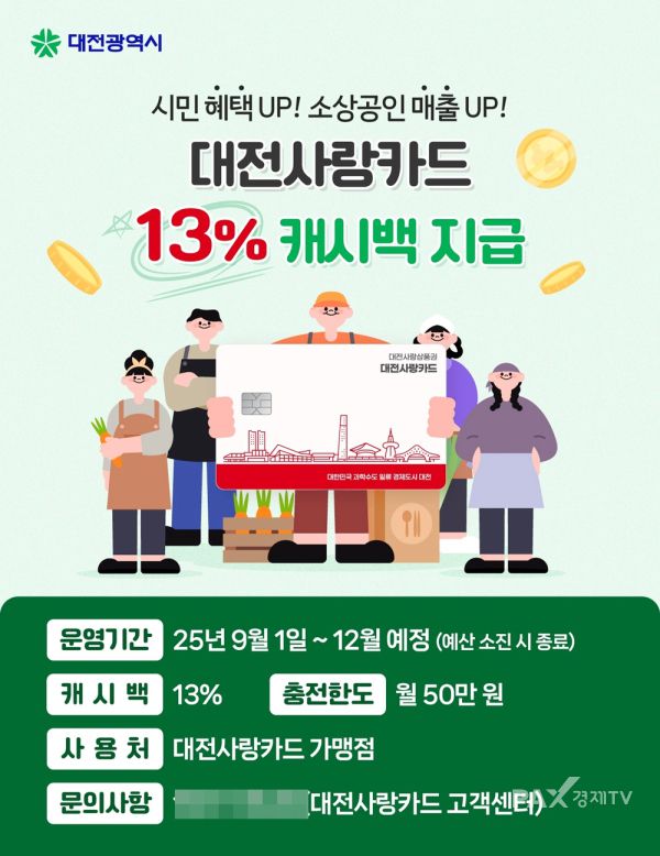 [사진제공=대전시][대전=팍스경제TV] 대전시는 오는 9월 1일부터 연말까지(예산 소진 시 조기 종료) '대전사랑카드'의 캐시백 혜택을 기존 10%에서 13%로 확대한다고 오늘(27일) 밝혔습니다.