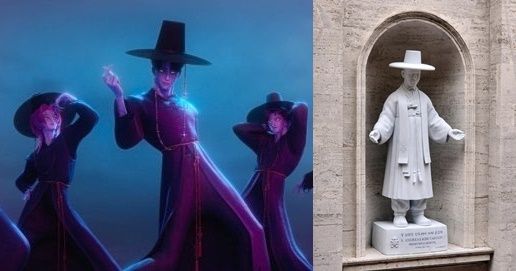 해외 네티즌들은 두루마기를 입고 갓을 쓴 김대건 신부의 성상이 케데헌에 등장하는 보이그룹 ‘사자 보이즈’를 연상시킨다는 반응이다.