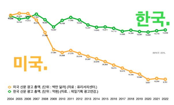 미국에서는 신문 광고 총액의 80%가 줄었는데, 한국에서는 20% 정도가 줄어드는 것에 그쳤다. (출처 : 슬로우뉴스)