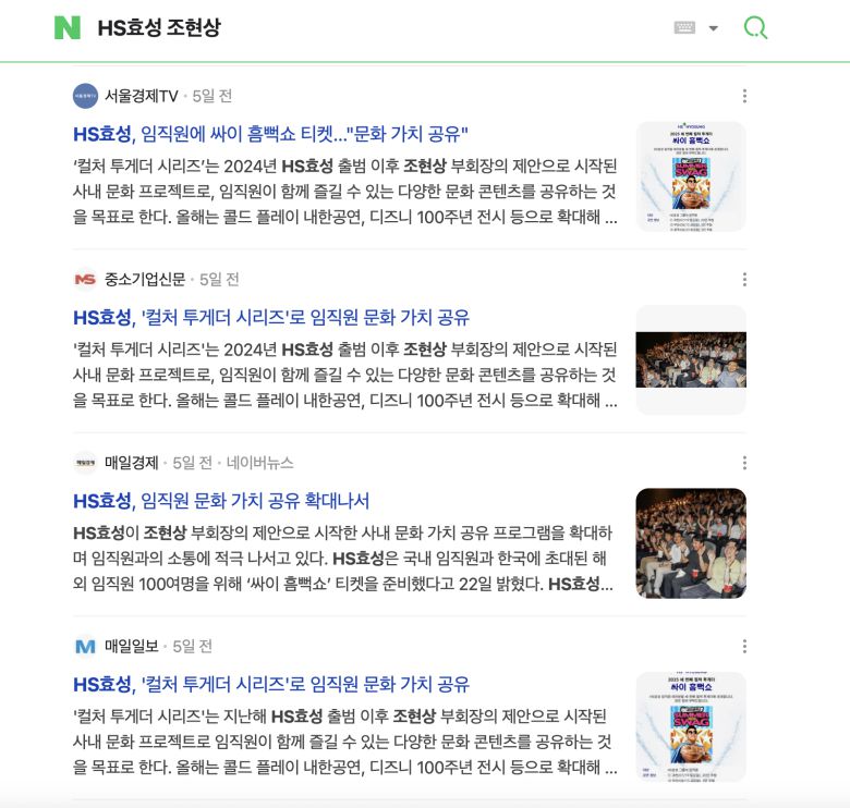 “HS효성, ‘컬처 투게더 시리즈’로 임직원 문화 가치 공유" (2025.8.22, 뉴스1)