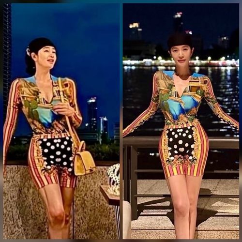 사진 속 그는 독특한 패턴이 돋보이는 타이트 핏 프린팅 원피스를 입고 등장했다. 몸에 착 붙는 디자인은 잘록한 허리와 긴 다리 라인을 드러내며 170cm의 비율 끝판왕을 자랑했다.