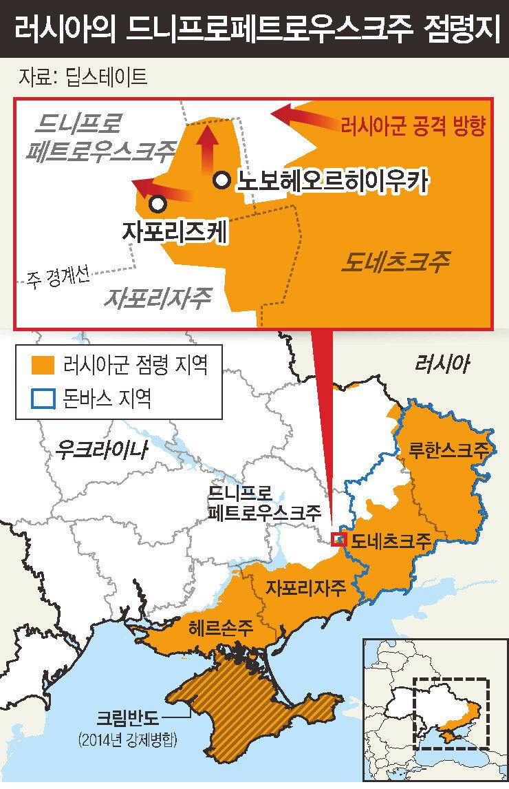 러시아군이 우크라이나 중부 드니프로페트로우스크(드네프로페트롭스크)주 일부를 점령했다고 우크라이나군이 처음으로 인정했다. 기존 격전지 돈바스(도네츠크·루한스크주)를 넘어 수도 키이우에 더 가까운 내륙까지 러시아가 밀고 들어온 셈이다.