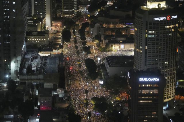 ▲ 26일(현지시간) 이스라엘 텔아비브에서 수십만 명의 사람들이 인질 석방과 전쟁 종식을 촉구하는 시위에 참여했다. ⓒAP=연합뉴스