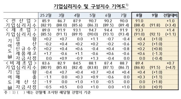 이혜영 한은 경제심리조사팀장은 "관세협상 타결로 통상 불확실성이 낮아진 가운데 반도체와 자동차 중심으로 수출이 호조세를 보였다"며 "휴가철과 소비쿠폰 영향으로 운수창고업과 도소매업이 개선됐다"고 분석했다.