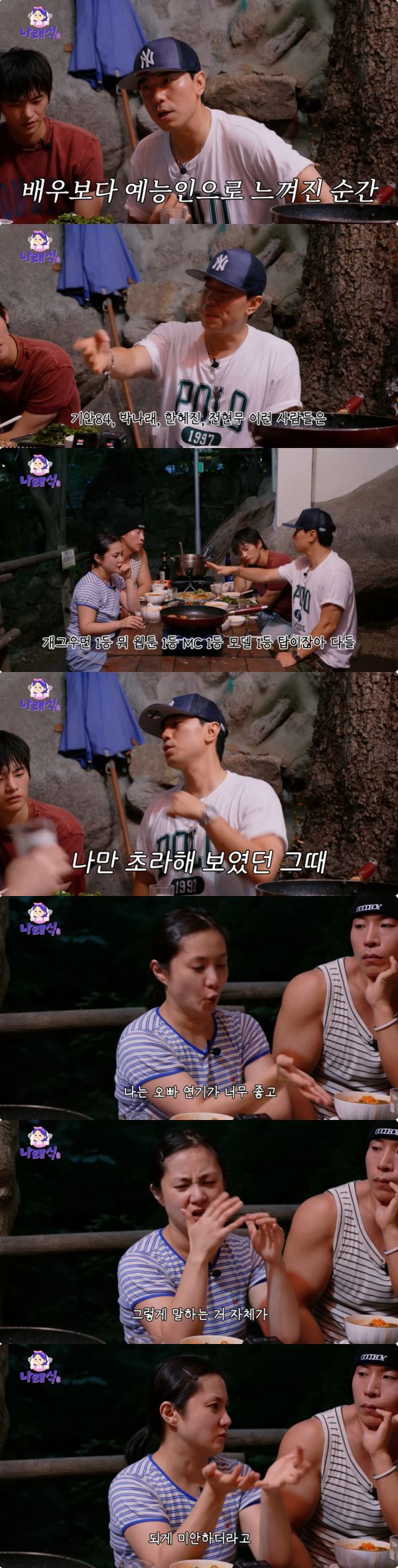 그는 "자신감이 점점 떨어진 게 뭐냐면, 기안84, 박나래, 한혜진, 전현무 이런 사람들은 대한민국 최고들이다. 코미디언 1등, 웹툰 1등, MC 1등, 모델 1등 다들 톱이지 않나. 이런 사람들 사이에 내가 배우로 끼어 있다는 게 (너무 초라해보였다)"고 털어놨다. 이에 박나래는 "그렇게 말하지 마라. 나는 오빠 연기가 너무 좋고, 좋으니까 하는 거지. 어느 순간 그렇게 말하는 거 자체가 되게 미안하더라. 이런 게 그냥 의미 없는 위로처럼 들릴까봐"라고 말했다.