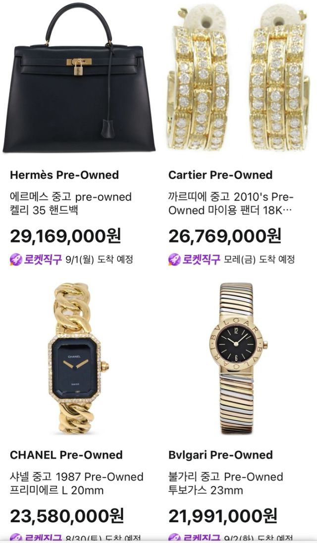 이런 흐름에 발맞춰 쿠팡도 명품 직구 서비스에 이어 중고 명품 판매 시장에 본격적으로 뛰어들었다. 쿠팡은 이달 초부터 럭셔리 버티컬 서비스 알럭스(R.LUX)를 통해 에르메스·루이뷔통·샤넬·구찌 등 글로벌 명품 브랜드 의류·가방과 피아제·오메가 등 시계의 중고 상품을 판매하기 시작했다. 주문은 로켓직구 형태로 4~7일 안에 배송된다.