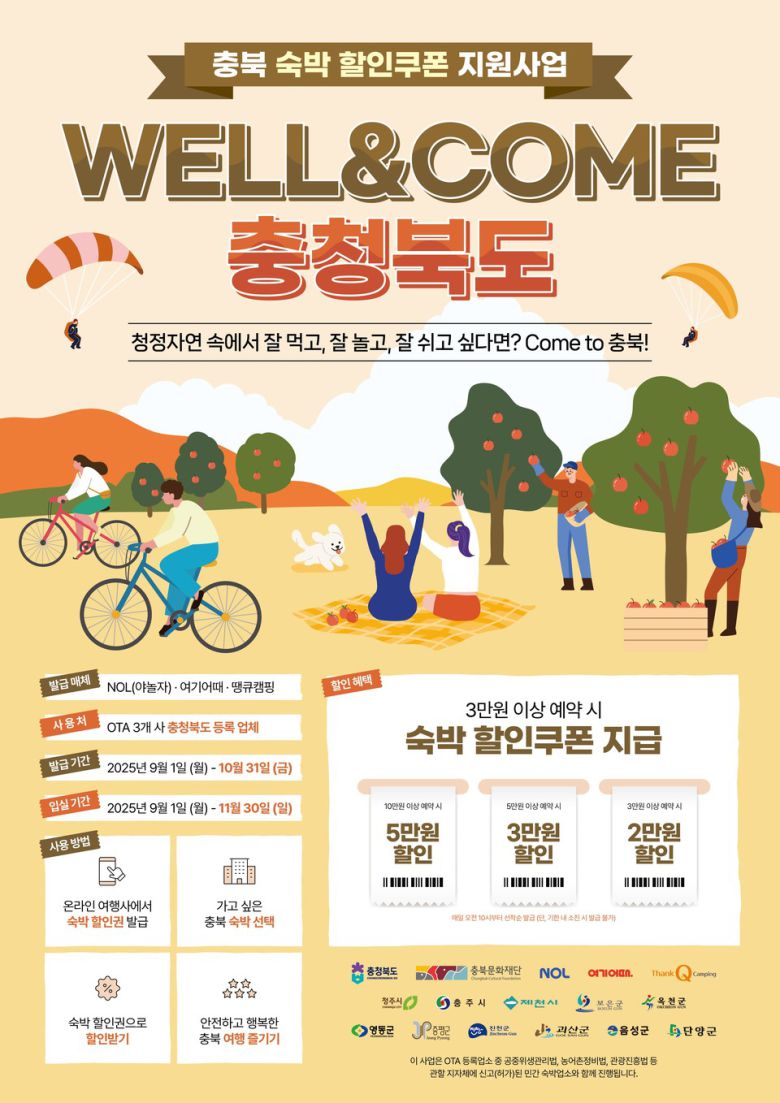 충북도가 11개 시·군, 충북문화재단과 함께 9월 1일부터 10월 31일까지 '충북 숙박할인쿠폰 지원사업' 2차 기획전을 진행한다.