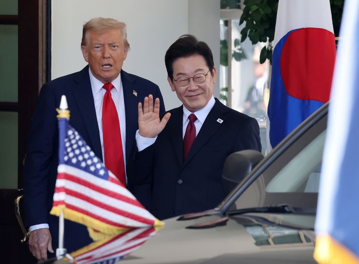이재명 대통령이 지난 25일(현지시간) 한미 정상회담을 위해 미국 워싱턴 DC 백악관에 도착해 도널드 트럼프 미국 대통령과 취재진을 향해 인사하고 있다. [사진 출처 = 연합뉴스] |