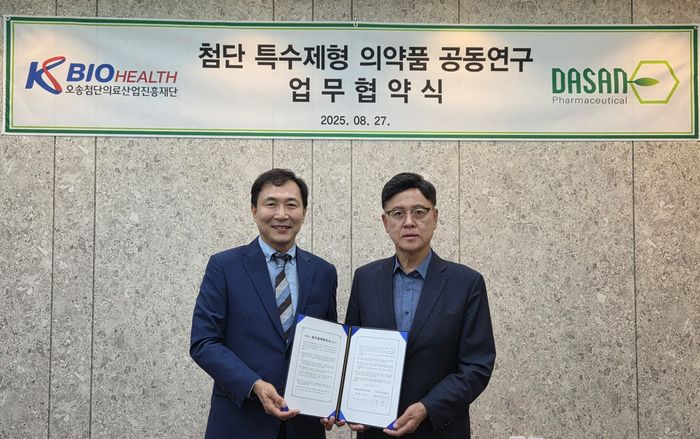 오송첨단의료산업진흥재단(KBIOHealth, 이사장 이명수)은 다산제약(대표 류형선)과 27일 특수 제형 의약품의 공동 연구개발과 글로벌 상용화를 위한 전략적 업무협약(MOU)을 체결했다.