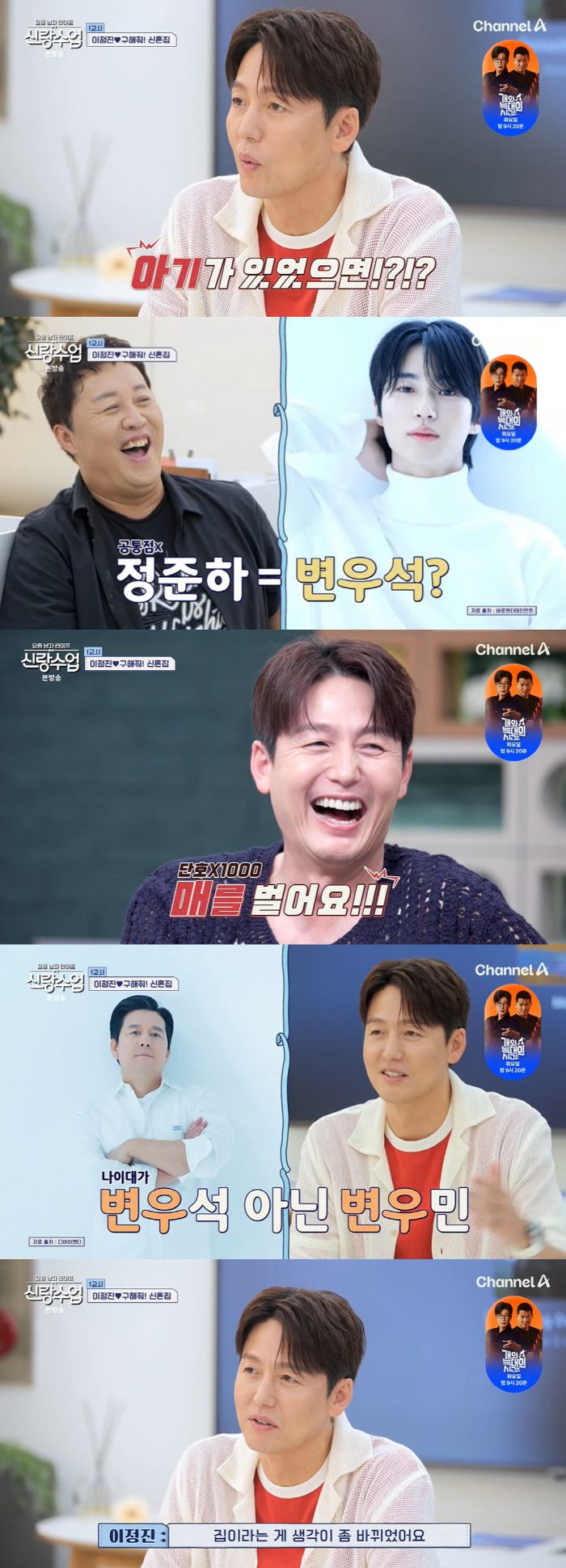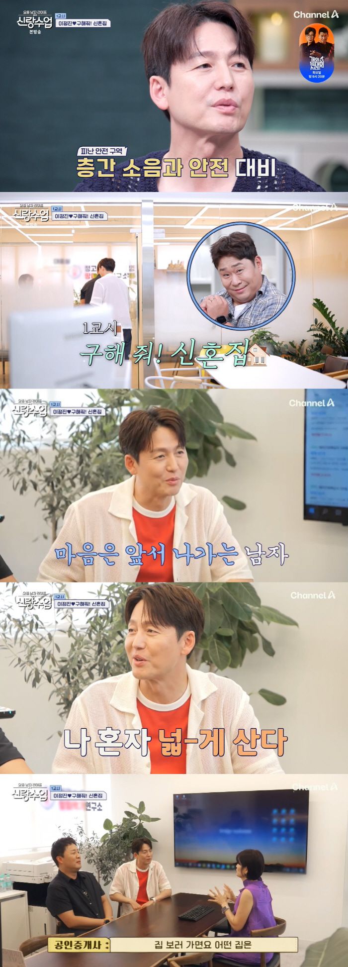 이정진은 "현재 48평형에 살고 있다. 방은 하나만 쓰고 있다"라며 했다. 이어 '원하는 집 조건'에 아이들 육아를 고려해 층간소음 걱정 없는 주택, 학군과 교육 인프라가 좋은 동네 등을 이야기 했다. '신혼집 예산'에 대해서는 집에 따라 다르다 전했다.
