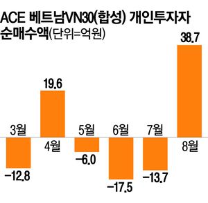 27일 한국거래소 정보데이터시스템에 따르면 이달 1~26일 개인투자자는 ACE 베트남VN30(합성) 상장지수펀드(ETF)를 38억6763만원어치 순매수했다.