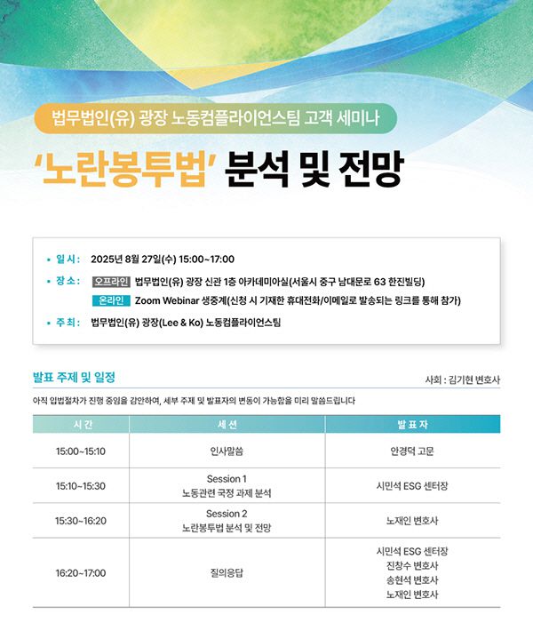 법무법인 광장은 27일 오후 3시부터 약 2시간 동안 서울 중구 광장 신관 1층 아카데미아실에서 '노란봉투법 분석 및 전망'이라는 주제로 세미나를 열었다. 노란봉투법은 하도급 노동자에 대한 원청 책임을 강화하고 쟁의행위 범위를 확대하는 동시에 파업 노동자에 대한 기업의 손해배상 청구를 제한하는 것이 골자다.