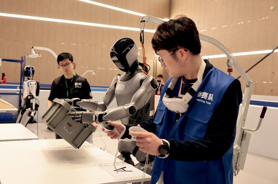 지난 5월 29일 상하이 장강(張江)과학홀에서 열린 ‘2025 국제 휴머노이드 로봇 기술 경진대회’에서 한 로봇이 자료 정리 작업을 하고 있다. 세계 60여 개 팀이 참가해 기술을 겨뤘다. [신화=연합뉴스] |