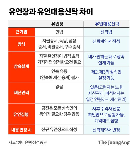 중앙일보의 프리미엄 구독서비스 ‘더중앙플러스(https://www.joongang.co.kr/plus)’는 지식·정보·인사이트를 한번에 얻을 수 있는 투자 콘텐트를 제공합니다. 오늘 ‘추천! 더중플’에선 ‘모르면 손해’인 유언대용신탁 활용법을 총정리했습니다. 어떤 사람이 가입해야 하고 뭘 고려해 결정해야 하는지, 꼭 알아둬야 할 내용을 소개합니다.