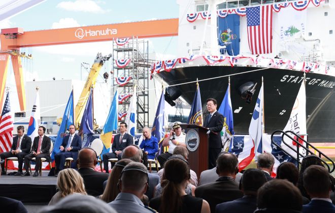 이 대통령은 이날 미국 펜실베이니아주 필라델피아의 한화 필리조선소에서 미국 해양청이 발주한 국가안보다목적선(NSMV) ‘스테이트 오브 메인’호의 명명식에 참석해 이같이 연설했다. 이 대통령은 “대한민국의 조선업이 미국 해양 안보를 강화하고 미국 조선업의 부활에 기여하는 새로운 도전의 길에 나서게 된다”며 “동맹국의 대통령으로서 대단히 기쁘게 생각한다”고 말했다.