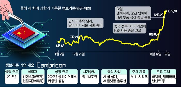 이 기업은 중국 정부가 미국 엔비디아 H20 칩의 보안 취약점을 지적한 뒤 투자금이 몰려들었다. H20은 엔비디아가 중국 시장을 겨냥해 생산해왔던 AI 칩이다.