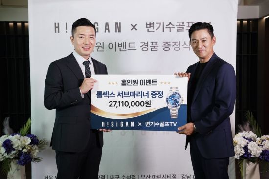 왼쪽부터 하이시간 이흥철 영업이사와 주진모 배우가 이벤트 경품 증정식을 갖고 있다. 하이시간
