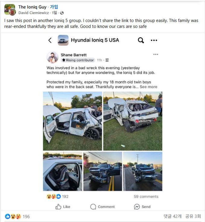 이 소식은 미국과 한국의 온라인 커뮤니티로 전파되며 화제가 되고 있다. SNS 계정명 'David Ciemiewicz'는 "이 가족은 후방 추돌 사고를 당했지만 다행히 모두 안전하다"며 "아이오닉 5가 이렇게 안전해서 다행이다"고 사고 소식을 전달했다.