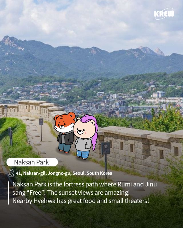 관광공사가 운영하는 한국관광통합플랫폼 VISITKOREA와 사회관계망서비스(SNS) 등에 케데헌을 통해 한국에 관심을 갖게 된 외국인이 쉽게 정보를 찾을 수 있도록 주요 배경지를 소개한다. 주인공 루미와 진우가 오리지널 사운드 트랙(OST) 중 하나인 Free를 함께 부른 낙산공원을 비롯해 경복궁, 북촌 한옥마을 등이 그 대상이다.