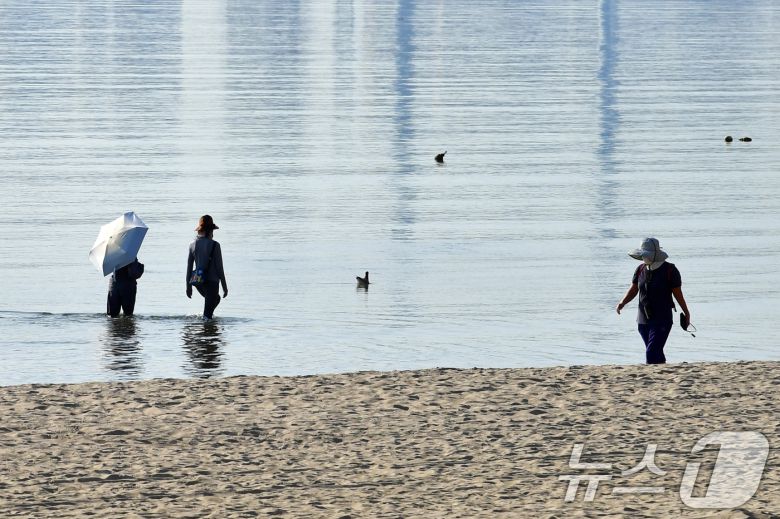 경북 포항시 북구 영일대해수욕장에서 시민들이 바닷물에 발을 담그고 걸어가고 있다. 2025.8.27/뉴스1 ⓒ News1 최창호 기자 |