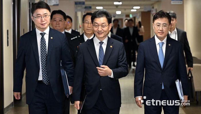 보이스피싱 근절 종합대책 브리핑이 28일 서울 종로구 정부서울청사에서 열렸다. 윤창렬 국무조정실장(가운데)과 류제명 과학기술정보통신부 제2차관(왼쪽), 이진수 법무부 차관 등 참석자들이 브리핑실로 향하고 있다. 이동근기자 foto@etnews.com [Copyright © 전자신문. 무단전재-재배포금지] 이 기사의 카테고리는 언론사의 분류를 따릅니다.0공유하기