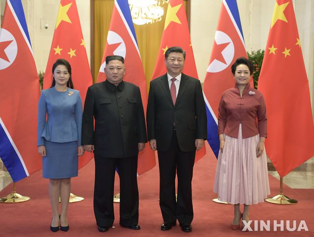 [베이징=신화/뉴시스]김정은 북한 국무위원장과 리설주 여사가 2019년 1월 8일 중국 베이징에서 시진핑 국가주석 및 펑리위안 여사와 기념촬영을 하고 있다. 2025.08.28. |