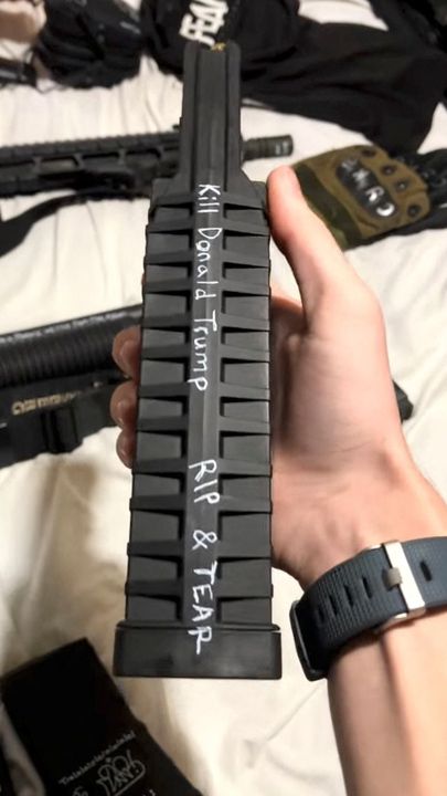 "도널드 트럼프를 죽여라"라고 쓰인 소총 탄창을 들고 있는 로빈 웨스트먼. 로이터=연합뉴스 |