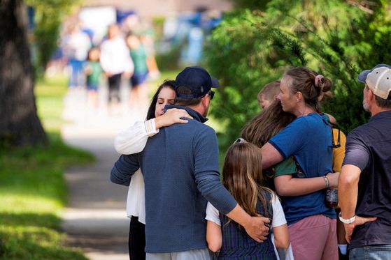 미국 미네소타주 미니애폴리스에 있는 ‘수태고지 가톨릭 학교’에서 총격 사건이 발생한 후 경찰 바리케이드 밖에서 해당 학교의 학생이 그의 가족과 포옹하고 있다. 로이터=연합뉴스 |