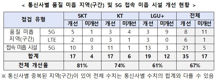 결과적으로 5G 품질 미흡 지역 19곳 중 8곳, LTE 7곳 중 6곳이 개선됐으며, 5G 접속 미흡 시설은 26곳 중 21곳이 개선됐다. 통신사별 개선율은 SK텔레콤 81%(21개 중 17개), KT 74%(23개 중 17개), LG유플러스 61%(31개 중 19개)였다.