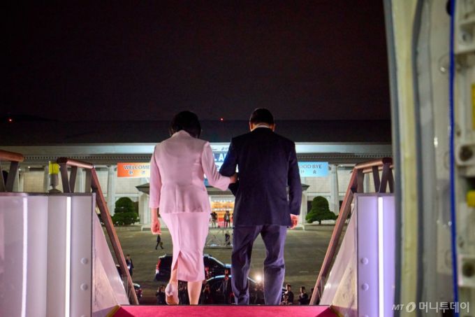 (서울=뉴스1) 이재명 기자 = 일본·미국 순방 일정을 마친 이재명 대통령과 김혜경 여사가 28일 새벽 경기도 성남 서울공항을 통해 귀국하고 있다. (이재명 대통령 SNS. 재판매 및 DB 금지) 2025.8.28/뉴스1 Copyright (C) 뉴스1. All rights reserved. 무단 전재 및 재배포, AI학습 이용 금지. /사진=(서울=뉴스1) 이재명 기자