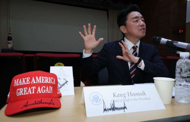 강훈식 대통령비서실장이 28일 용산 대통령실에서 열린 기자간담회에서 도널드 트럼프 미국 대통령에게 자신이 받은 선물에 대해 설명하고 있다. 트럼프 대통령의 사인이 있는 마가 모자, 오찬 메뉴판, 비서실장 명패 등이 강 비서실장 앞에 놓여 있다. 연합뉴스 |