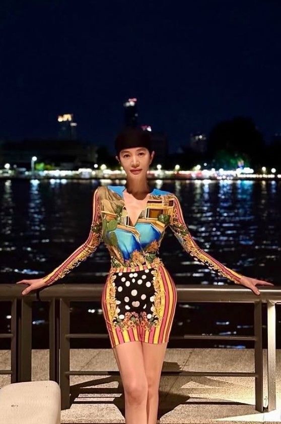 몸에 밀착되는 미니 원피스를 입은 김혜수는 특유의 고혹적인 분위기와 우아한 자태를 뽐냈다. 은은한 조명이 얼굴선을 부드럽게 감싸며, 뒷배경의 야경과 어우러져 한 폭의 영화 같은 장면을 연출했다.