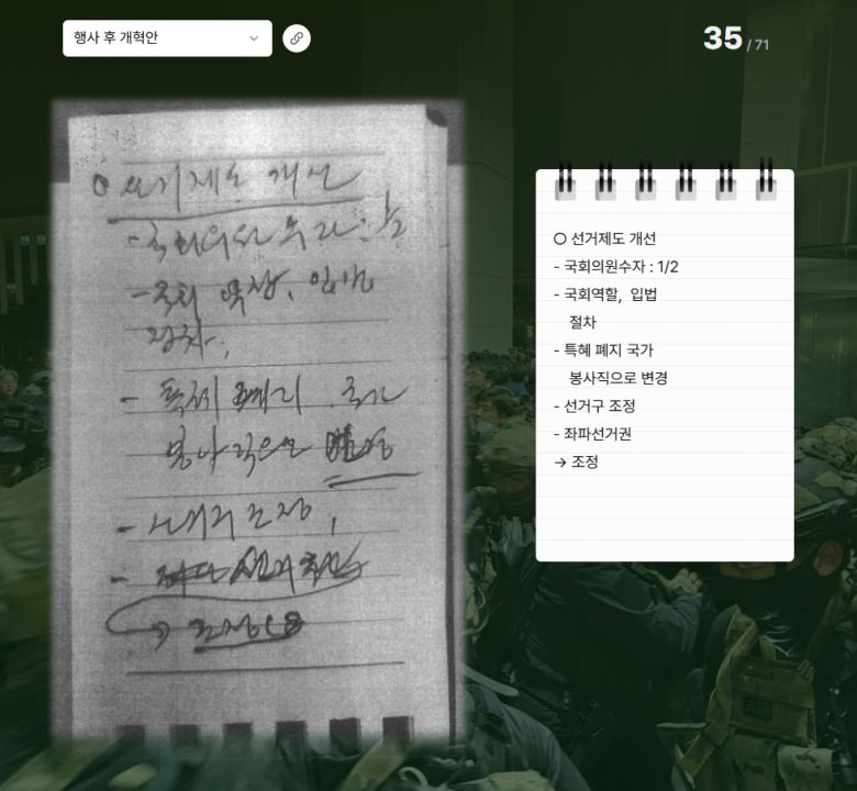 ‘행사’(계엄) 이후 정치 제도 개편안도 담겼다. '노상원 수첩' 35쪽에는 국회의원 숫자를 절반으로 줄이고, 국회의원의 특혜를 폐지하며 봉사직으로 변경하겠다는 대목이 나온다. 또한 계엄 중 체포되어 수감된 이들은 형 집행이 끝나고 5년간 선거권을 박탁하며, 헌법 개정을 통해 대통령이 재선 내지 3선에 성공하는 것을 도모했다. 헌법 개정과 함께 ‘국가안전관리법’을 제정하는 계획도 들어있다.(34쪽)'노상원 수첩' 35쪽. 계엄 후 정치 제도 개혁안 특별페이지 해당부분 화면 캡처