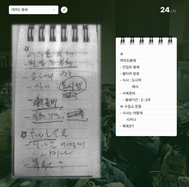 '노상원 수첩'에 따르면, ‘행사’(계엄) 당일 여의도에서 ‘수거’(체포)를 시작해 전국으로 확대한다는 계획이 기록되어 있다. 경찰이 국회 출입구를 봉쇄하여 모든 민간인 출입을 통제하며, 봉쇄 기간을 2~3주간으로 예정한 것에 따른 경비인력의 식사와 목욕 문제까지 고민한 흔적도 담겨있다.'노상원 수첩' 24쪽. 여의도 봉쇄 방안 ‘봉쇄기간: 2~3주, 식사는 어떻게 시키나, 목욕은?’ 특별페이지 해당부분 화면 캡처